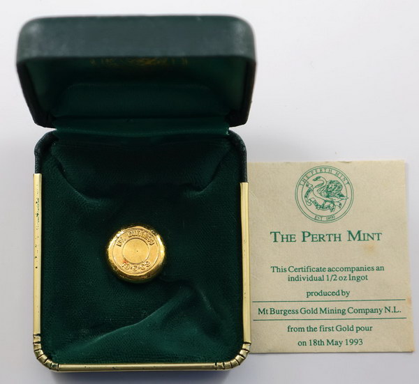 | Description: 1993 1/2 oz gold ingot Mt Burgess Gold Mining Co N.L, assayed and stamped by The Perth Mint from the first gold pour 18-5-1993. In case with COA. VF-EF |