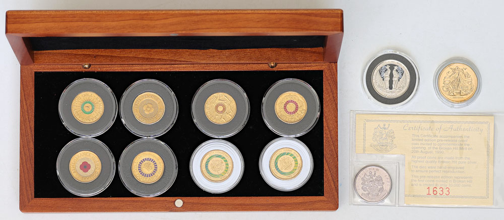 | Description: Small collection of mostly coloured 2 Dollar circulation issues: 2012 Remembrance red poppy, 2012 Remembrance uncoloured, 2013 QE II Coronation purple, 2014 Remembrance green dove, 2015 Remembrance orange, 2015 Lest We Forget red, 2018 Commonwealth Games green (2). Also New Zealand 2015 Remembrance coloured 50 Cent, 2019 Treaty of Versaille al/br Dollar and 1990 Broken Hill Mint silver Proof round medallion with COA. Some scarce. In jarrah box. (11 coins total). UNC |