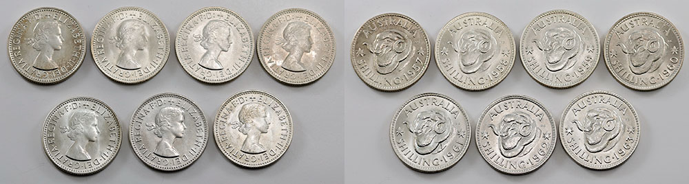 1957, 1958, 1959, 1960, 1961, 1962, 1963. Mint bloom. (7 coins total).
