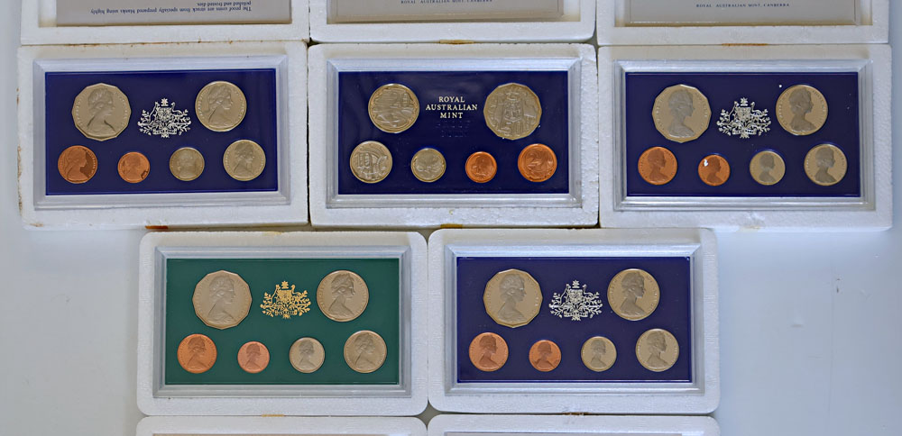1973, 1976, 1977 (2), 1978, 1979 Double Bar, 1980, 1981, 1982, 1983 Proof sets. With foams. (10 items total).