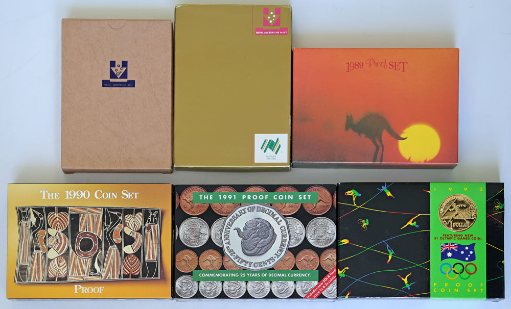 1985, 1988, 1989, 1990, 1991, 1992 Proof sets. Minor marks. (6 items total).