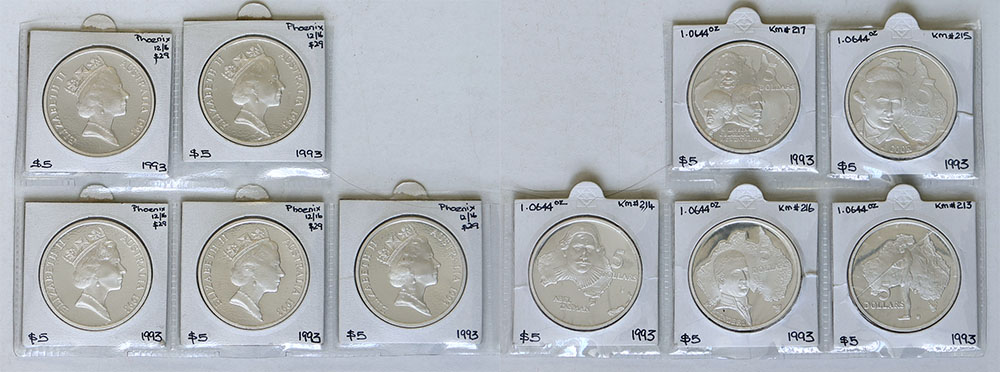 | Description: 1993 Masterpieces in Silver: The Explorers set of 5 $5 silver Proofs (5.32 oz TSW). Coins only, no packs or COAs. (5 coins total). FDC |