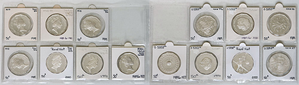| Description: 1989 Masterpieces in Silver: 50 Cent Tributes set of 5 silver Proof 50 Cents. Also 1991 25th Anniversary and 2000 Royal Visit silver Proof 50 Cents (4.49 oz TSW). Coins only, no packs or COAs. (7 coins total). FDC |