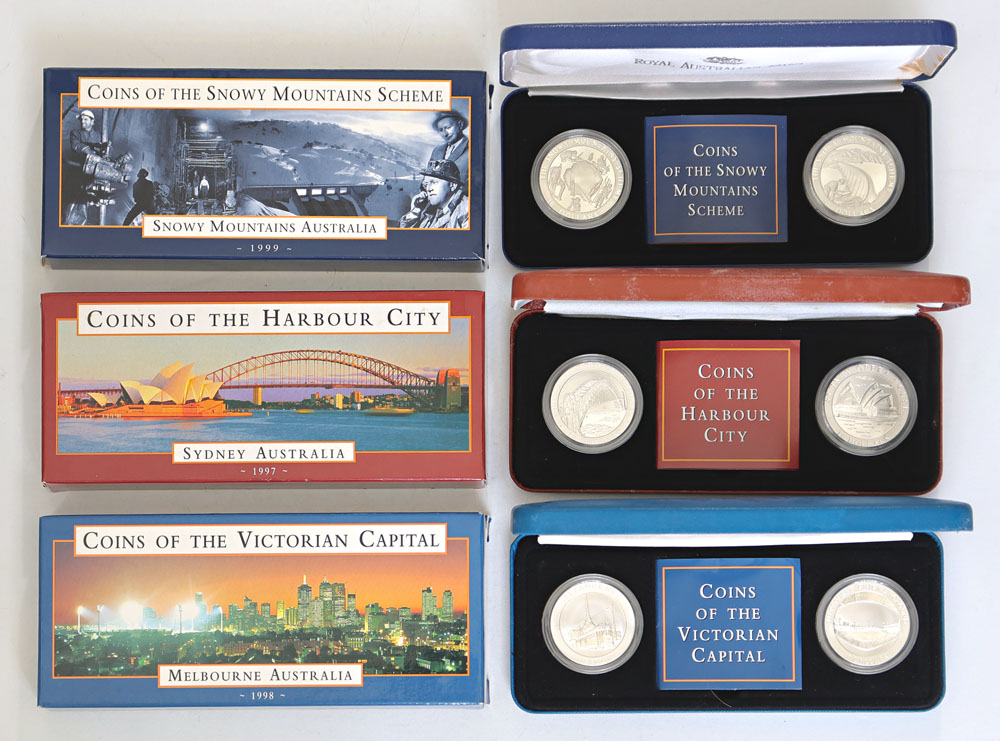 | Description: 1997, 1998, 1999 Australian Landmarks: Coins of the Harbour City, Victorian Capital and Snowy Mountains silver 2-coin sets. In boxes of issue with COAs (some environmental marks to case of first). (3 items total). UNC |