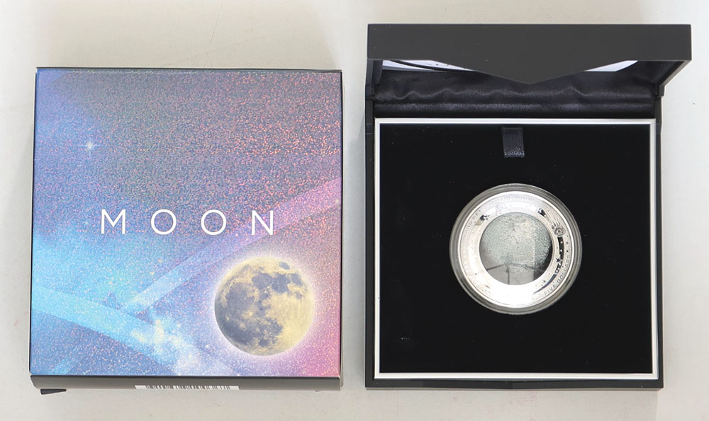 2019 Earth and Beyond: The Moon coloured domed 1 oz silver Proof. In box of issue with COA. High retail value.