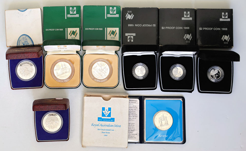 | Description: 1982 (2), 1988 (2) 10 Dollar silver Proofs. Also 1985 10 Dollar silver Unc and 2 Dollars 1988 silver Proofs. In boxes of issue with COAs (one 1982 with no box). (8 items total). UNC-FDC |
