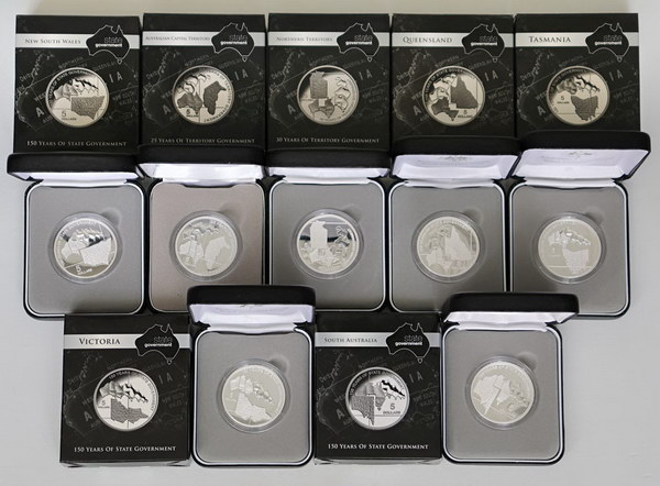 2009 150 Years of State Government set of 7 silver Proof issues: ACT, NSW, NT, QLD, SA, TAS, VIC (36.31g ea). (7 items total).
