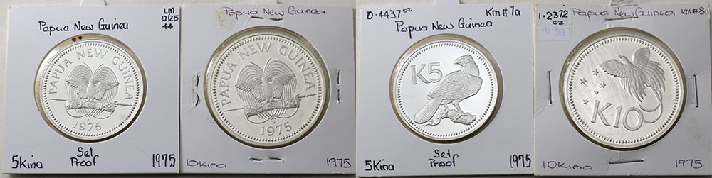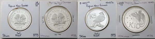Papua New Guinea silver Proof 5 Kina and 10 Kina 1975. In flips. (2 coins total).
