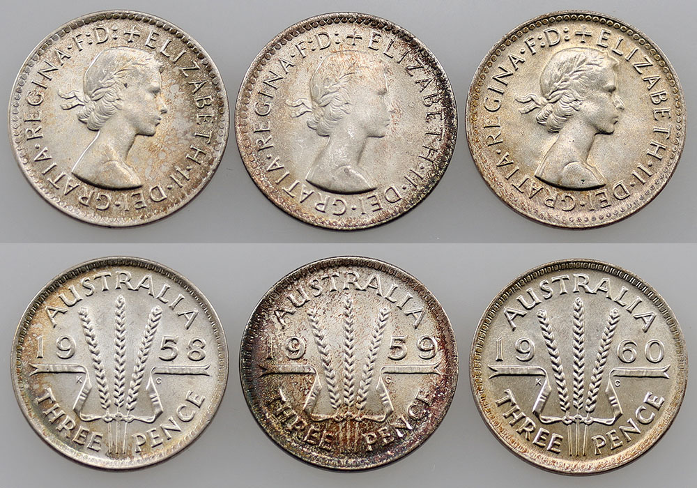 Threepence. 1960, 1961 (2), 1962, 1963 (3). ...