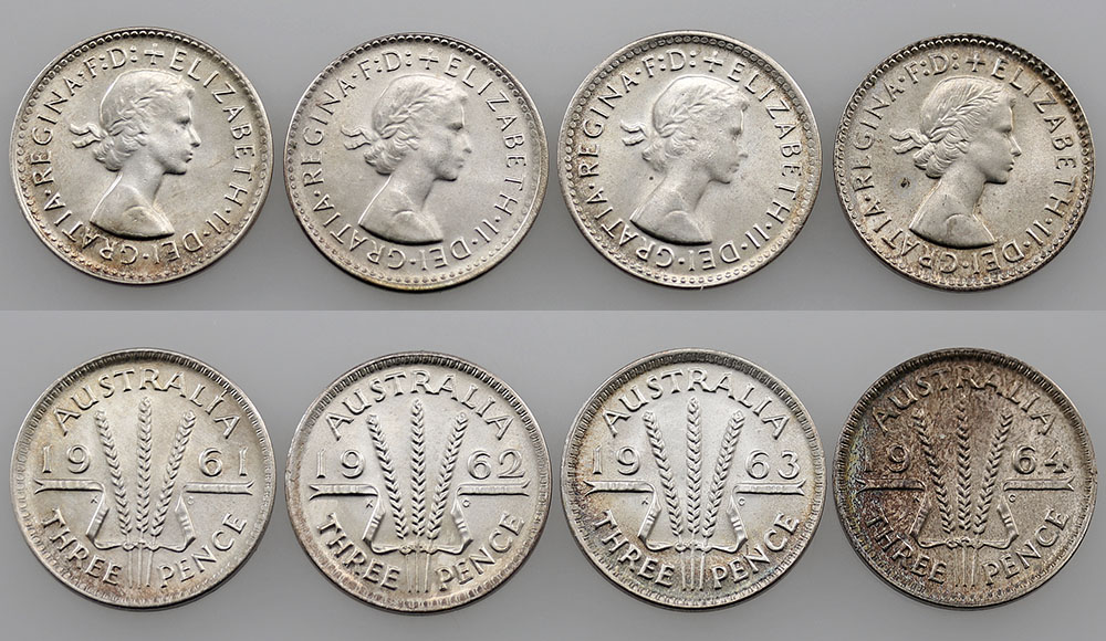 Threepence. 1960, 1961 (2), 1962, 1963 (3). ...