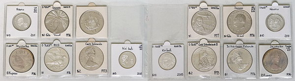 | Description: British Virgin Islands 1 Dollar 1976, Cook Islands 2 Dollar 1973, Kiribati 10 Dollar 2015, Nauru 10 Dollar 2011, Samoa 1 Tala 1974, 1977, Seychelles 10 Rupees 1974; silver Proof issues. (7 coins, approx 4.5 oz TSW). FDC |