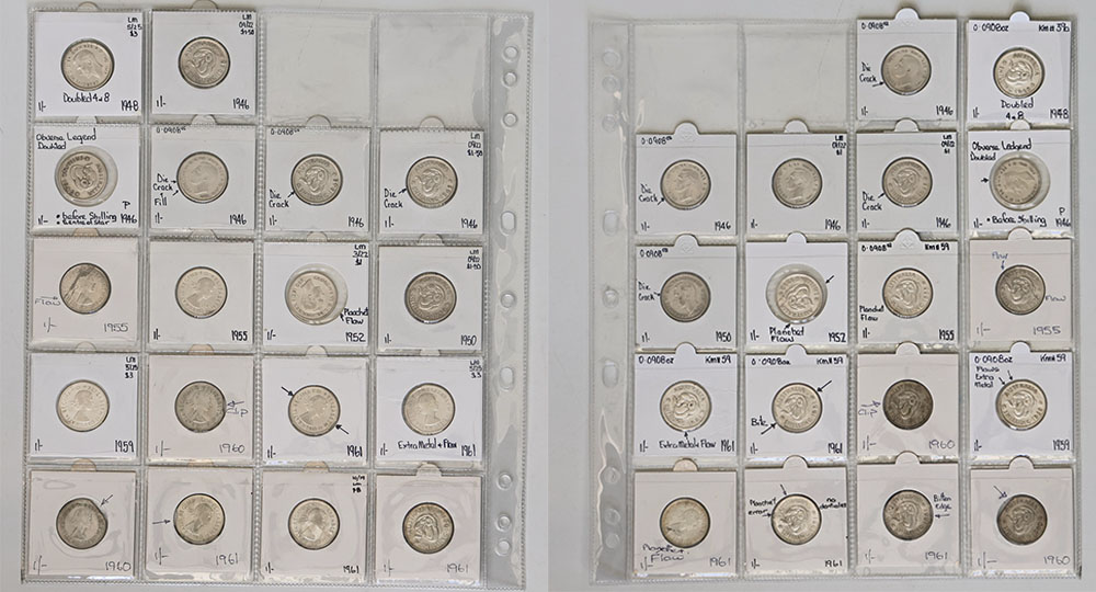 Small collection of Shillings 1946-1961, all with minor varieties, die cracks or flaws etc. In flips as annotated. (18 coins total).