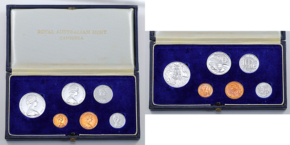 | Description: 1966 Pattern Trial strike 1966 Proof set, 1 Cent to Round 50 Cent. Struck in c1965 in the style of the 1963 Proof set, with full brilliant Specimen Proof polished finish rather than the frosted and brilliant style of the officially released sets. Likely came about as a trial design or hastily prepared sample. Unique, and a highly important piece of Australian numismatic history and poignantly offered on the Centenary year of the Decimal series. In dark blue RAM case, coins perfect. Unique. FDC |