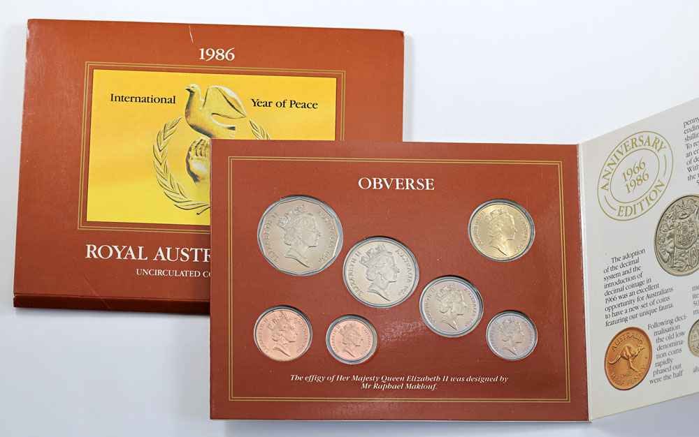 1986 RAM Error Mint set Year of Peace. With 1985 10 Cent in error. In pack of issue, sealed. Very scarce.