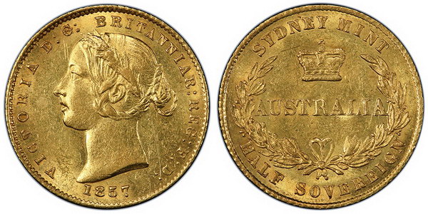 | Description: 1857 Sydney Mint, Type II. Victoria Young head. PCGS graded MS 62 (38264980). Mint bloom, and in nice condition with minimal wear for this tough to find in high grade date. Pop 5 with only 3 example higher. Ex Monetarium privately 1989 (from the India Hoard disbursed by Spink in 1976). Rare. UNC/Ch.UNC |