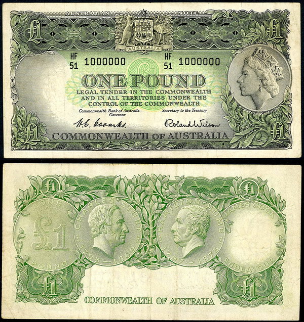 | Description: 1953 Coombs-Wilson (R 33m). Commonwealth Million serial numbered note. With last digit hand-printed. Small split at top, old flat folds. Ex IAG S 67 March 2007 (Lot 421). Very rare, with only 15 known, and much rarer than the 1961 issue. F/gFINE |