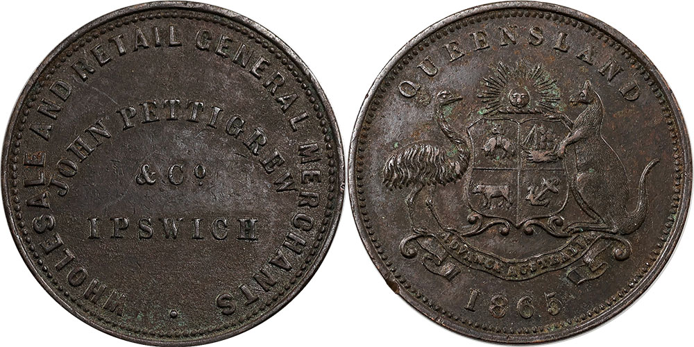 Pettigrew, John copper Penny Token 1865. Ipswich Qld (A438/R428). Rarity 2.