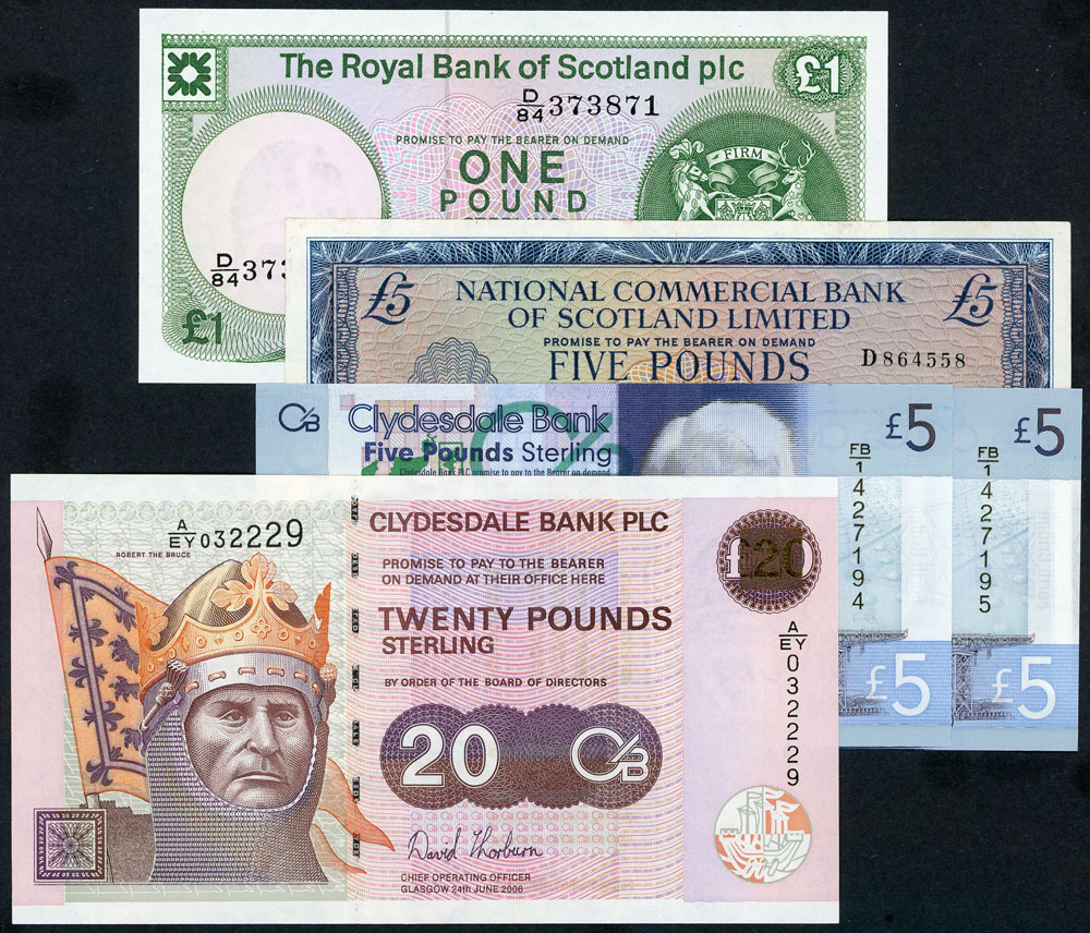 | Description: Scotland 1 Pound 17-12-1986 D/84 (P 341b), 5 Pound 13-2-2015 polymer FB/1 (P 229) consecutive pair, 20 Pound 24-6-2006 (P 229), 5 Pound National Commercial Bank 1-8-1963 (P 272a) (cleaned). (5 notes total). aEF-UNC |