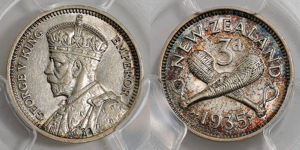 New Zealand Threepence 1935. Key date. PCGS graded AU 58 (29921466). Some tone.