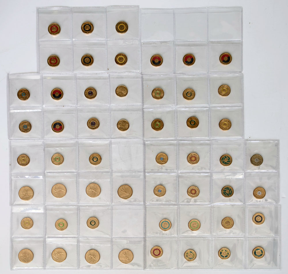 Assorted mostly coloured issues 2021-2025 (45) and 1 Dollars Matildas 2023 (8). (53 coins total, $98 FV).