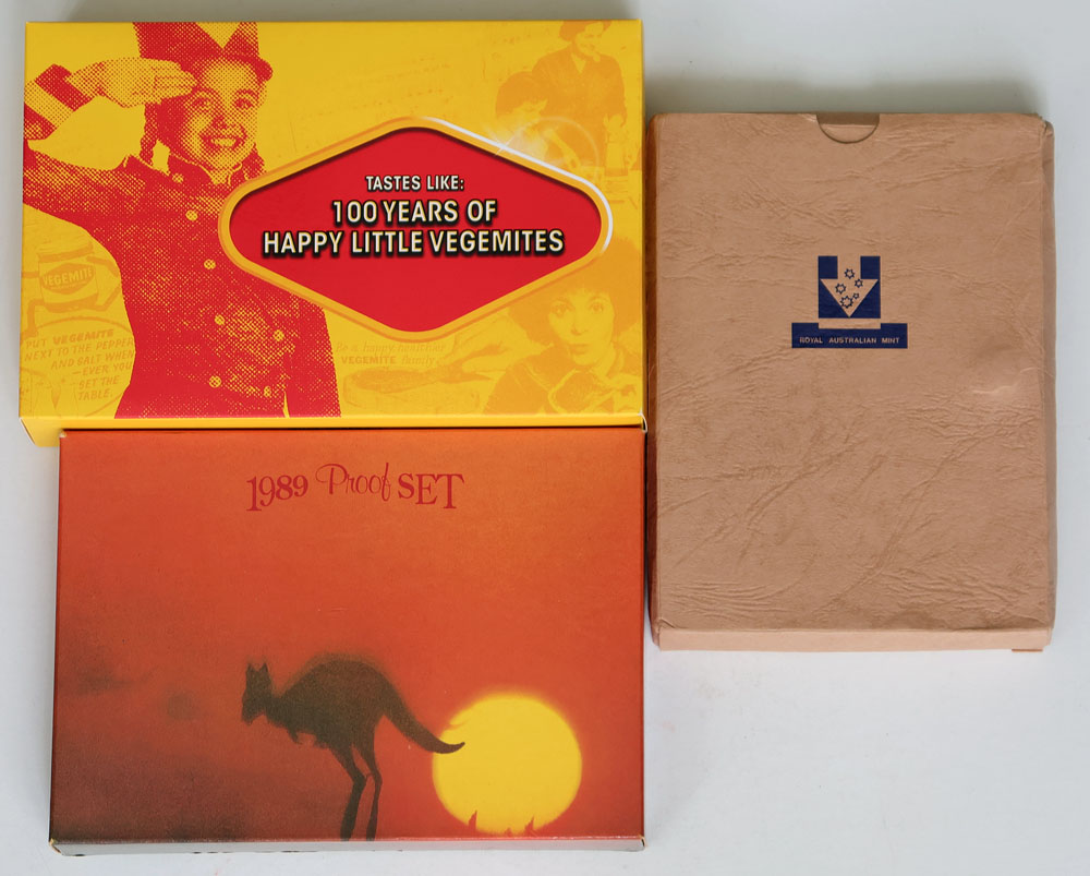 1985, 1989, 2023 Vegemite Proof sets. (3 items total).