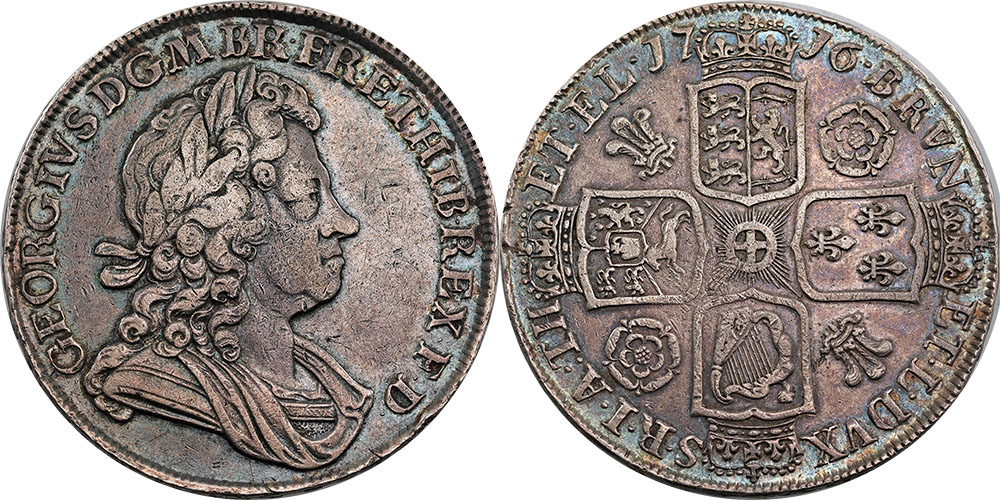 Crown George I 1716. Laureate and draped bust right; Roses and plumes in angles. Medium grey old toned with hints of peripheral blue lustre. Scarce.