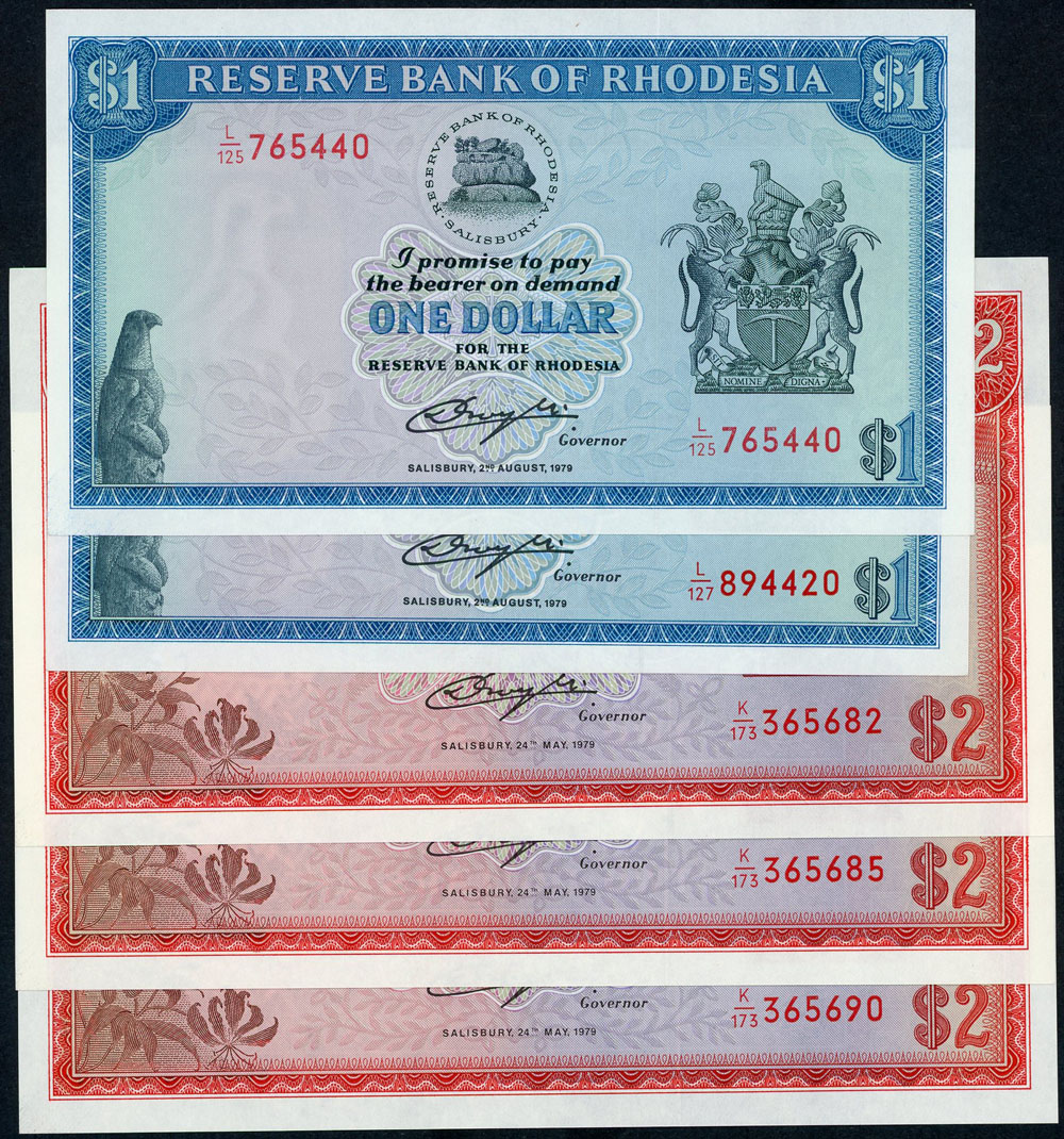 Rhodesia 2 Dollar 1979 (P 39) (3) and 1 Dollar 1979 (P 38a) (2). Very slight handling. (5 notes total).
