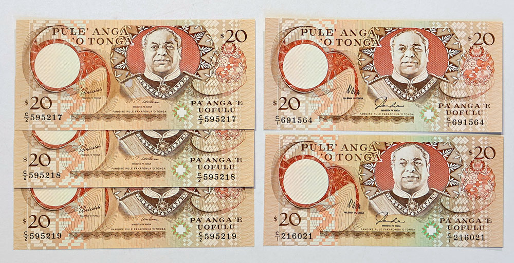 Tonga 20 Dollar 1995 (P 35a) (2), (P 35c) trio. (5 notes total).