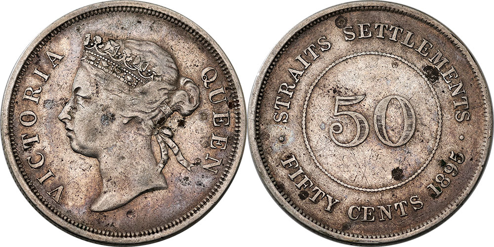 Straits Settlements 50 Cent 1895. Victoria. Some tone, evenly worn. Scarce.