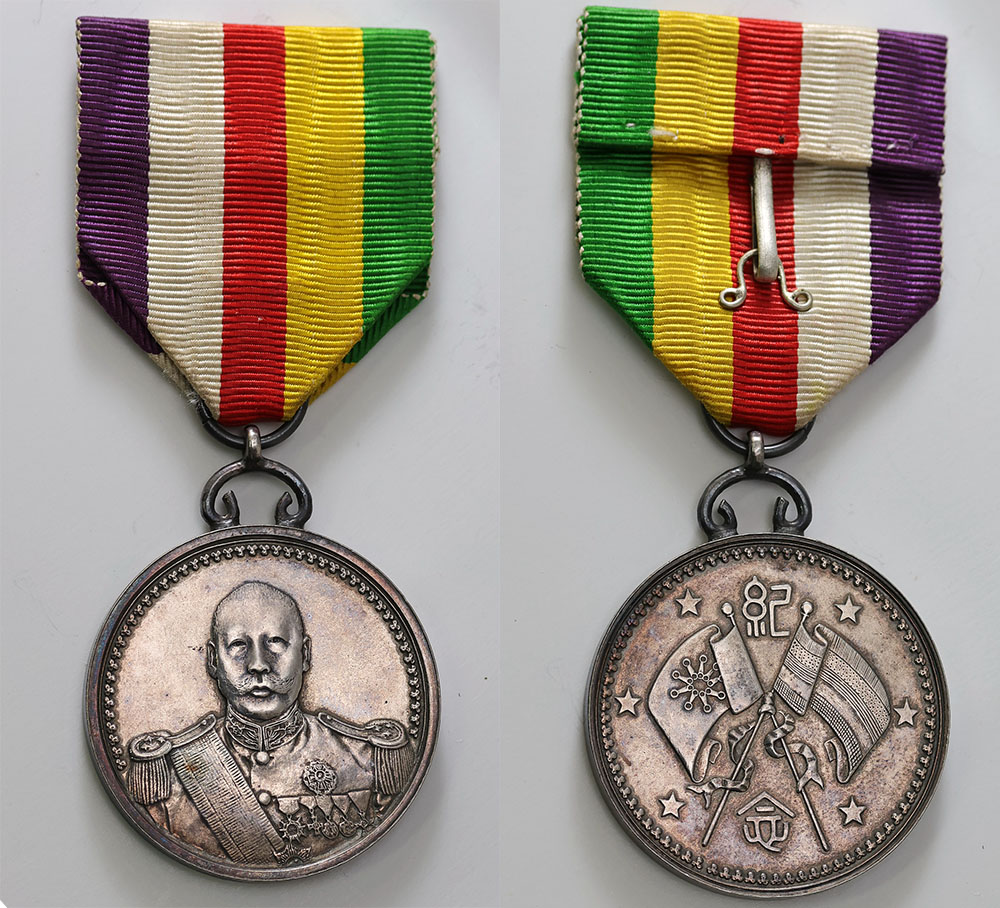 China Republic silver medal (36mm). Chiang Kai Shek in military uniform/crossed flags. With striped ribbon, toned. Scarce.