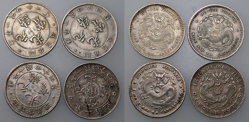China 20 Cents 1909: Hupeh Province (2), Hsang Tung Province and Fukien Province (dipped). Some tone. Scarce. (4 coins total).