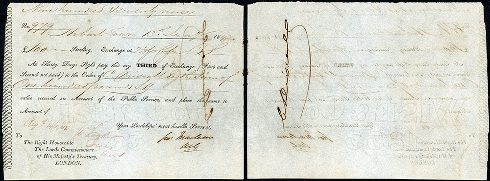 | Description: 1842 Bill of Exchange, Public Service Hobart Town 15-1-1842, No 979. Single-sided Third of Exchange for 100 Pounds Sterling on thin plain paper with Wise and Co 1833 watermark. Payable to C. Driscoll esq and endorsed on back. Three pinholes, some slight tone and folds. Very scarce, especially this high amount. With tag as sold previously for $11,000. aEF |