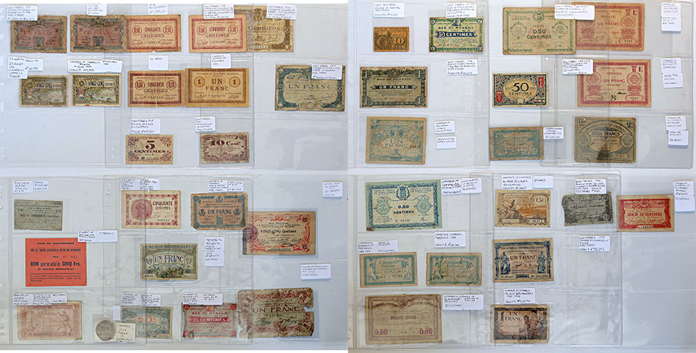 | Description: France WW I allies war-related collection (1915-22): 10 Centimes S DG4, 50 Centimes S BC38, 1 Franc S1284, 1 Franc S34, 50 Centime Nice, 50 Centimes Nice, 50 Centimes Doran, 1 Franc Bethune 1915, 1916, 2 Franc Bethune 1915, 50 Centime Saint Omer, 50 Centimes Marseille (2), Boulogne 1914, 50 Centime Calais, Regional 1916, 1 Franc Dijon 1917, Alpes-Maritimes 1920, 25 Centimes Treport N/D, Toulon and Duvar 1919 (2), 25 Centimes (Toulon 1921, 1922, 50 Centimes Damiens (3), 5 Centimes Lille SB, 10 Cent Lille SC, 50 Centimes Havre N/D, 1 Franc Havre 1917, 50 Centimes Sedan 1916, Carcassonne 5 Franc N/D, Army Treasury 1 chit SD, 5 Centimes paper round 1915, 50 Centimes Paris 1922, 1 Franc Stone, Autun and Louhans 1918, 1 Franc Provence 1922, 50 Centimes Provence, 25 Centimes Roubaix and Tourcoing N/D, 25 Cem=ntimes Ardennes 1915 and 1 Franc Dabbeville N/D. Most well-circulated, some with holes or stains but an otherwise well-curated collection of these historical notes. (42 notes total). VG-UNC |