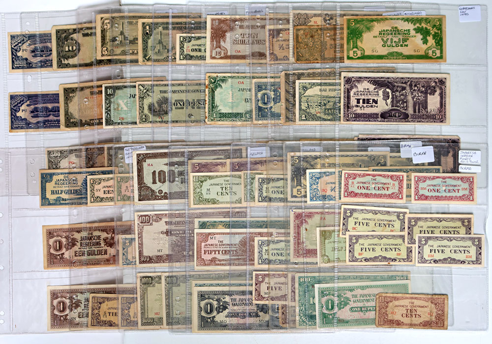 | Description: Japanese JIM note collection WW II. Appears mostly complete, with most issues from Burma, Malaya, Netherlands East Indies, Oceania (including two OA 10 Shillings) and Philippines. Some damaged. (80 notes total). POOR-UNC |