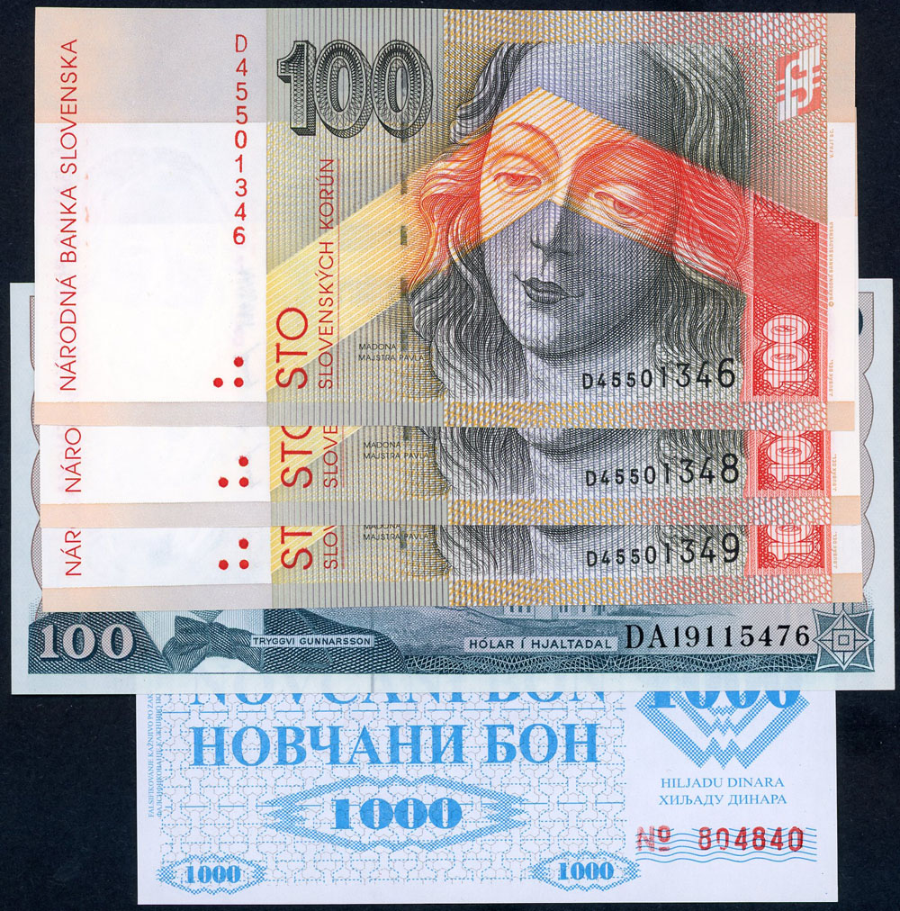Bosnia and Herzegovina 1000 Dinara 1992 (P 8b), Iceland 100 Kronur 1961 (P 44a), Slovakia 100 Korun 1993 (P 22a) (pair and single). (5 notes total).