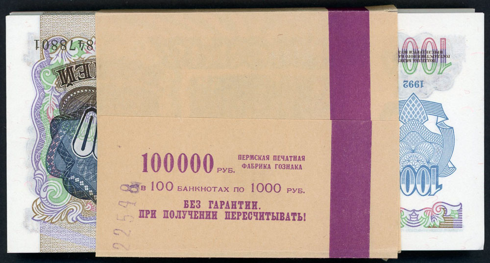 Russia 1000 Rubles 1992 (P 250a). Bundle of 100, with official bundle wrapper.