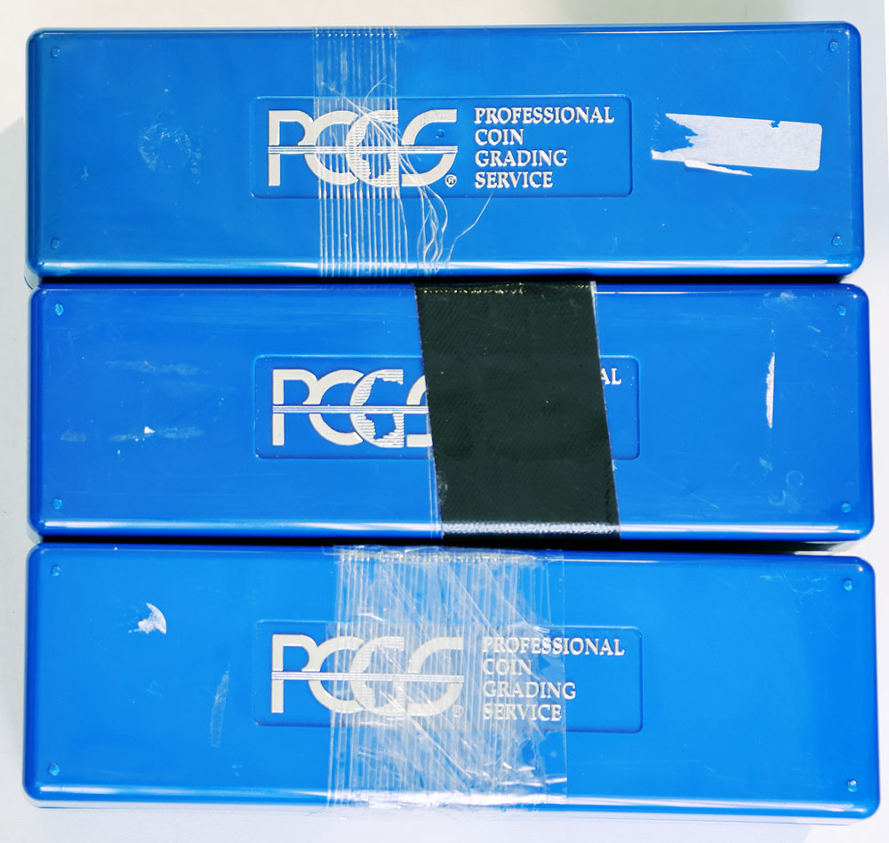 PCGS storage boxes; holds 20 slabbed coins each. Old tape/stickers. (3 items total).