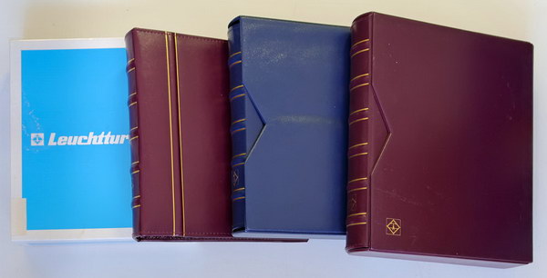 | Description: Leuchtturm Classic banknote albums; 3 maroon and 1 blue. One missing sleeve, another brand new in plastic wrap, others used, with some marks and old stickers etc. (4 items total). USED |