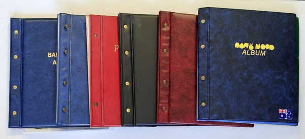 Renniks Banknote albums, pin style with front and back covers. Some marks as all used, various colours and number of pages. (7 items total).