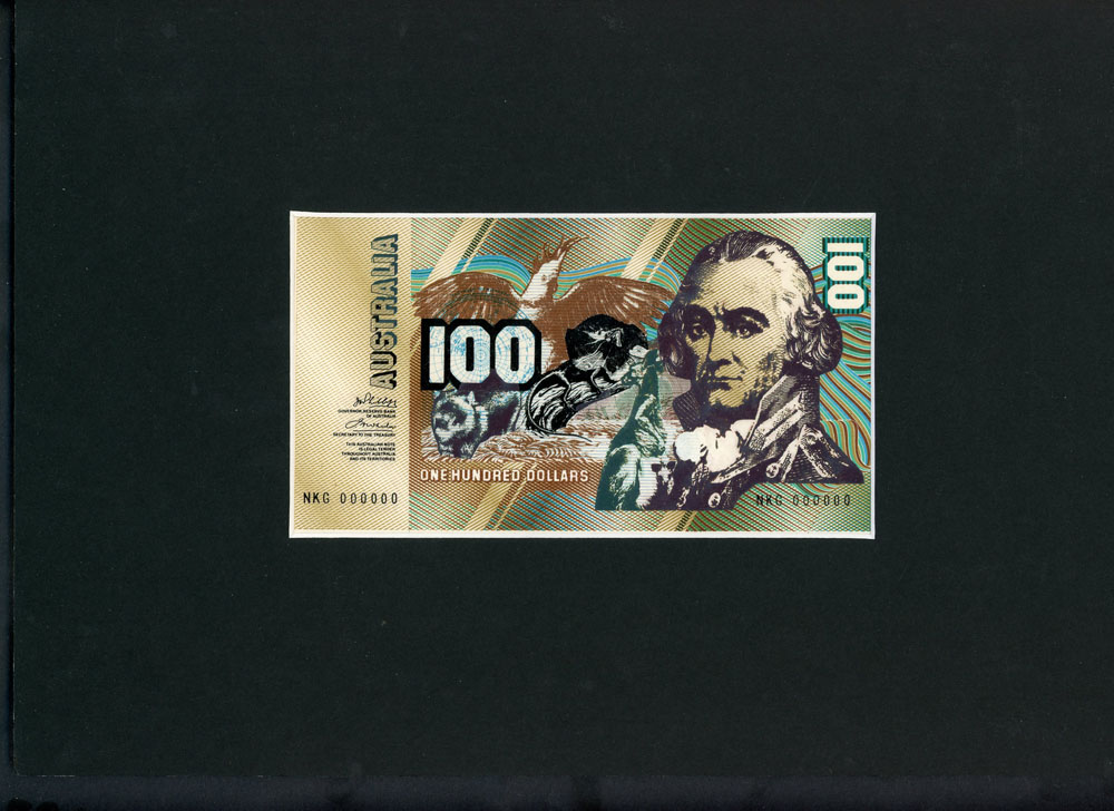 | Description: Proposed note design trial N/D (c1982). A proposal mock-up of a possible design. Appears to be a final design, mounted in cardboard frame (32cm x 16cm) with clear protective overlay, front design only. Design features a Wombat, Frilled-necked Lizard, Kangaroo, Cockatoo and portrait. In blue and grey with 100, AUSTRALIA at left, One Hundred Dollars at bottom, Phillips-Wheeler signatures and serials NKG 000000 twice along bottom. By designer, Max Robinson as part of a series of designs for the RBA and similar to the cover note for Vort-Ronalds book AUSTRALIAN DECIMAL BANKNOTES AND DESIGNS. Interesting and rare, high retail value. |